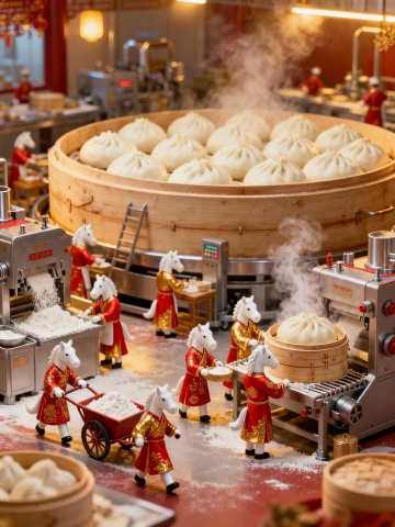 国潮风微缩艺术场景,拟人化马形角色身着中式红金服饰,忙碌于蒸笼与机器间,3D粘土质感融合卡通感,喜庆氛围扑面而来。