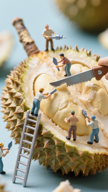清新卡通风格,微缩艺术展现工人在巨大果实上劳作,趣味盎然。