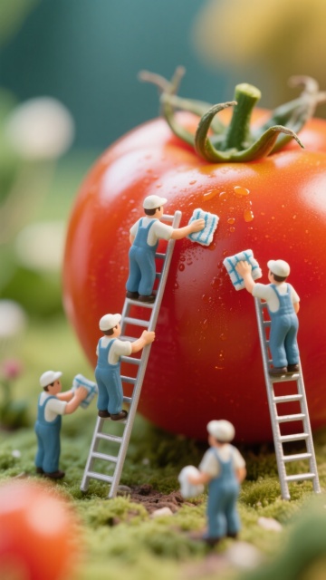 清新卡通风,微缩艺术展现小人清洁巨大番茄,趣味盎然。