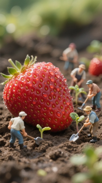 清新水彩风,微缩艺术展现超现实草莓世界,卡通小人忙碌其间,营造梦幻田园景象。