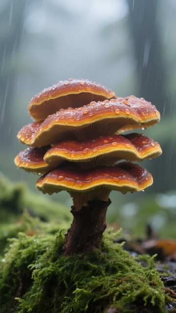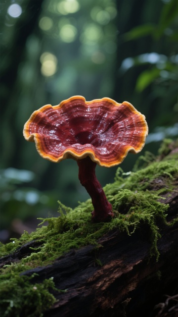 采用书法字体主标题 “早安” ,画面结合千年灵芝元素与武夷山特色元素,营造独特的氛围感,一个千年灵芝,纹路清晰,占画面上下一半,背景是大唐皇宫,雕栏玉砌,背景模糊。整个灵芝落在地面上,地面上铺了一层奢华的锦绣。