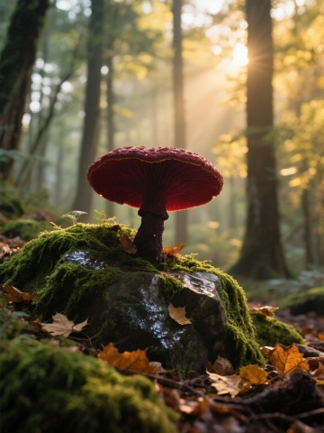 中式古典庙宇前,灵芝悬浮地毯之上,超现实国潮风,神圣感十足。