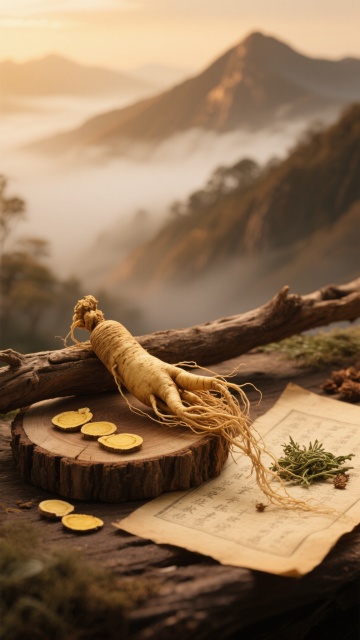 一张具有高度写实摄影风格的中药主题海报,主色调为温暖的棕黄色和土褐色,营造出古朴、自然、沉静的氛围。画面采用柔和的侧逆光,光线从左上方照射,在主体中药上形成明显的高光和细腻的阴影,增强立体感和质感。构图遵循三分法,主要物体集中在画面偏下位置,背景有浅景深的模糊处理。主体为一株完整的、形态饱满的人参,带有长长的须根,放置在一块粗糙的木质树桩切片上,树桩旁有一根横向的枯木枝干。人参旁边散落着几片切好的黄色药材薄片,一小撮干燥的绿色草药,以及一张泛黄的、上面有模糊文字的古老纸张,纸张上也放置了少量药材。背景替换为云雾缭绕的远山,山峰轮廓柔和,呈现出淡褐色调,与前景的中药元素和谐统一,整体画面质感细腻,细节丰富,光影过渡自然,传递出传统中医药的深厚底蕴与自然草本的纯净感。