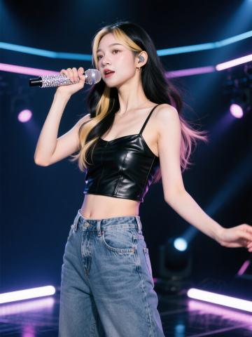 女生,黑金色挑染长发,穿黑色皮质吊带搭配牛仔长裤,手拿镶钻麦克风,动作活泼,站在韩范打歌舞台上,舞台光影交织。整体动感潮流。