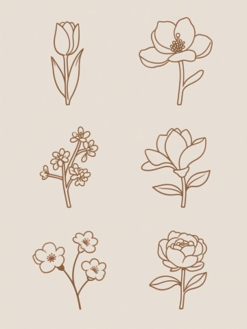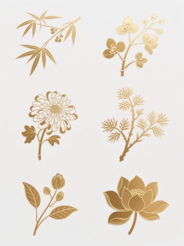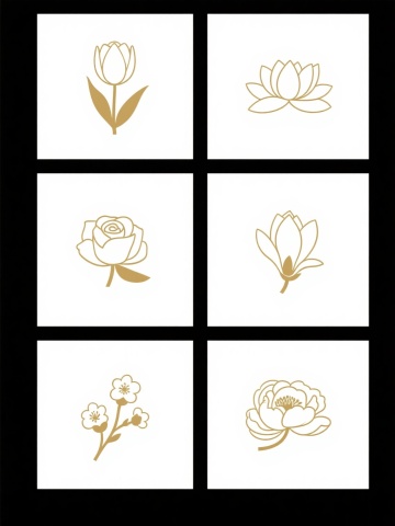 九组金色荷花图案,采用简约线条勾勒,包含盛开的荷花、含苞待放的花蕾、舒展的荷叶及漂浮的小荷叶,每组形态各异,线条流畅,造型雅致,以白色为背景,整体呈现出简洁、清新、具有东方韵味的设计风格。