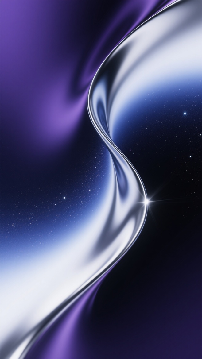 抽象流体渐变背景,以深邃神秘的暗紫色与夜空蓝为主色调,融合闪烁的银河银与星光白,呈现出类似液态金属的光滑质感与微妙光泽,流动的曲线形态优雅舒展,色彩过渡柔和自然,光影效果细腻,整体营造出宁静而富有科技感的氛围,画面简洁大方,具有现代设计感。