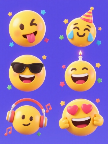 白色背景上,四个不同造型的3D卡通风格表情符号系列集合,保持圆润立体造型、光滑材质、柔和高光和阴影效果的统一风格,每个表情符号均有睁大的黑色眼睛、白色眼白、棕色眉毛、张开的嘴巴和竖起的大拇指,第一个为黄色主体配红色嘴巴,第二个为蓝色主体配紫色嘴巴,第三个为粉色主体配橙色嘴巴,第四个为绿色主体配红色嘴巴,表情从左到右依次为惊讶、开心、得意、兴奋,规整排列成两行两列,整体色彩鲜明活泼,视觉层次清晰,适合作为系列素材使用。