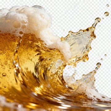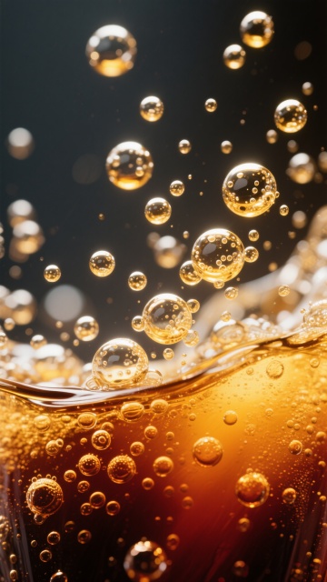 超写实摄影风格,一杯装满深琥珀色啤酒的高脚玻璃杯,顶部覆盖着厚实细腻的白色泡沫,啤酒从杯中剧烈飞溅而出,形成动感十足的金色水花和无数细小的酒滴,背景为深邃的黑色,点缀着散景光斑营造出梦幻氛围,整体光影对比强烈,强调液体的透明质感与泡沫的绵密肌理,水花四溅的动态瞬间被清晰捕捉,充满活力与清凉感。