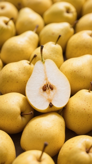 高写实摄影风格,以金黄色和橙色渐变为主色调的苹果群,整体构图为紧密排列的圆形布局,中央放置一个横向切开的苹果,露出白色果肉和棕色果核,所有苹果表面覆盖着晶莹的水珠,呈现出湿润的光泽感,光影效果为侧上方柔和光源,形成自然的明暗对比和高光反射,背景为深色,突出主体水果的鲜艳色彩和细腻质感,水果的形态饱满,果皮纹理清晰可见,整体氛围清新诱人,具有强烈的视觉冲击力和真实的质感表现。