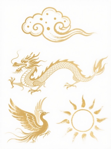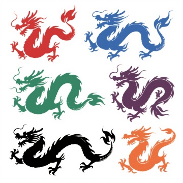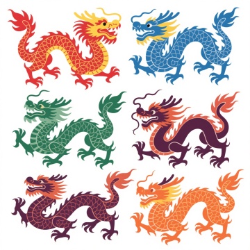 系列素材集合,规整排布于白色背景上,包含两个完全不同造型的东方神话风格神龙。左侧神龙采用中国传统水墨风格,通体呈朱红与墨黑渐变,龙角峥嵘,鳞片以浓淡不一的墨色勾勒,火焰状鬃毛与尾部呈鲜艳的朱砂红,龙爪锋利,身体呈盘旋上升姿态,颈部佩戴金色云纹项圈;右侧神龙为祥瑞琉璃风格,整体以青翠与明黄为主色调,鳞片如琉璃般半透明并带有金色光泽,鬃毛与尾部呈流动的青色火焰状,龙角饰有水晶般的蓝色纹路,身体呈S形蜿蜒,姿态更为舒展飘逸,颈部同样佩戴金色项圈但纹饰为回纹样式。两者均保持东方神龙的核心元素:蛇身、兽爪、鹿角、虾眼,风格统一为精致的插画风格,线条流畅,细节丰富,光影表现细腻,整体构图平衡对称,形成既统一又各具特色的系列感。
