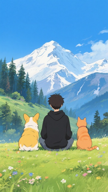 清新水彩插画风,湖光山色映蓝天,自然宁静。