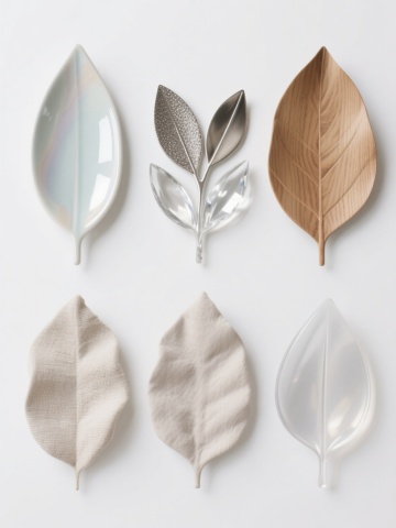 纯白背景上规整排布的六个不同材质的叶子系列素材集合,每个叶子保持原图像中的相同造型和轮廓线条,包含单片叶、双片叶等多种形态,整体色彩变换为丰富多样的色调,第一个叶子呈现光滑亮泽的陶瓷材质质感,带有细腻的釉面反光和柔和色彩;第二个为磨砂金属材质,表面有细微颗粒感和哑光金属色泽;第三个是透明水晶材质,晶莹剔透,带有内部折射光影效果;第四个是木质纹理材质,展现自然的木纹肌理和温暖色调;第五个是柔软的织物材质,具有布面纹理和轻微褶皱感;第六个是光滑的塑料材质,带有半透明感和均匀的色彩分布,所有叶子元素在白色背景上整齐排列,形成一组视觉统一又各具特色的系列素材,整体保持简洁现代的设计感,信息传达清晰直观。