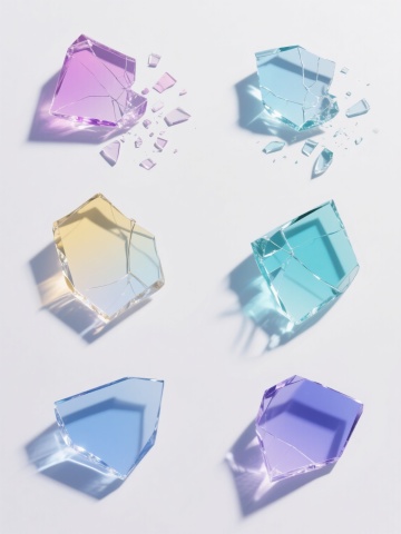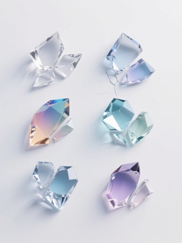 一张包含四个规整排布的不同元素集合的海报,每个元素都采用3D渲染的透明玻璃质感设计,具有棱角分明的几何切割面、光滑透亮的表面、强烈的光线折射效果和璀璨的高光点,元素类目保持为自然界生物形态,背景为纯白色纯色背景;第一个元素为蓝色与紫色渐变的蝴蝶,翅膀呈现多面体切割,边缘有金色光边,整体光影明亮通透;第二个元素为绿色与黄色渐变的树叶,叶片脉络清晰呈几何切割状,表面有露珠折射光点,光影柔和清新;第三个元素为红色与橙色渐变的花朵,花瓣层次分明且边缘锐利,花蕊部分有金属光泽点缀,光影温暖热烈;第四个元素为粉色与青色渐变的飞鸟,身体线条流畅,羽毛呈多边形片状叠加,翅膀展开有动态飘逸感,光影梦幻轻盈;整体画面风格统一,每个元素独立清晰,色彩对比鲜明且和谐,视觉层级明确,信息传达简洁高效,设计感现代时尚,符合追求精致、高端、自然与科技感融合的目标受众审美。