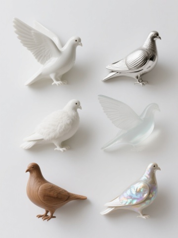 纯白色背景上,六个不同造型的鸽子元素以规整的网格排布形成系列素材集合。每个鸽子均保留其基本形态特征,但造型各异:有的展翅翱翔,翅膀呈流线型舒展;有的收翅停歇,头部微侧;有的低头梳理羽毛,姿态温婉;有的昂首挺胸,眼神坚定;有的单脚站立,另一只脚蜷缩;有的双翅半张,似欲起飞。六种鸽子分别采用完全不同的材质表现:1. 光滑细腻的陶瓷材质,表面有细微的釉面光泽和温润质感;2. 带有金属拉丝纹理的银白色金属材质,反光强烈且具有冷硬质感;3. 柔软蓬松的白色羽毛材质,保留真实羽毛的纹理和轻盈感;4. 半透明的磨砂玻璃材质,光线透过时呈现柔和的朦胧感;5. 具有木质纹理的实木材质,展现木材的自然纹路和温暖色调;6. 带有光泽的珍珠母贝材质,表面有虹彩般的珠光效果。整体画面简洁干净,鸽子造型清晰,材质特征鲜明,布局规整有序,视觉层次分明,营造出统一且富有变化的系列感。
