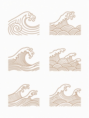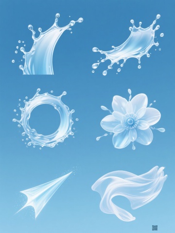 六个完全不同材质和造型的浪花图案,均采用纯色背景,保持浪花核心内容但形态各异。第一个浪花为晶莹剔透的玻璃材质,呈现不规则几何切割造型,边缘锐利,带有折射光斑;第二个是柔软的绒毛材质,造型圆润蓬松,边缘呈波浪状卷曲,整体像一朵漂浮的云;第三个为金属材质,呈现出工业风的棱角分明造型,表面有拉丝纹理和反光效果;第四个是木质材质,造型模仿自然木纹的走向,呈现出有机的曲线和结节;第五个是透明的果冻材质,造型饱满Q弹,带有半透明效果和内部气泡;第六个是手绘水墨材质,造型写意流畅,边缘晕染模糊,呈现出东方艺术的韵味。所有浪花均保持蓝色调,但根据材质不同呈现出深浅不一的蓝色变化,整体风格统一又各具特色。