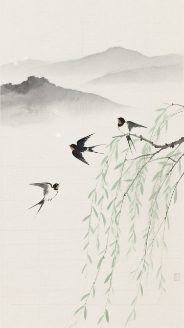 中国水墨画风格,淡雅米色宣纸背景,柔和的淡绿色与浅棕色晕染,笔触轻盈写意,留白充足,营造宁静自然的氛围。画面右侧上方有飘逸的柳枝,细长的枝条上点缀着嫩绿的柳叶,部分叶子带有淡淡的橙红色调。画面下方左侧有几丛细长的兰草,叶片呈深绿色,边缘带有红色线条。画面中央偏下位置,一只红色的蜻蜓停栖在灰褐色的细树枝上,翅膀透明,身体纤细,头部微微抬起,周围环绕着几片嫩绿的新叶,整体构图疏朗有致,意境悠远。