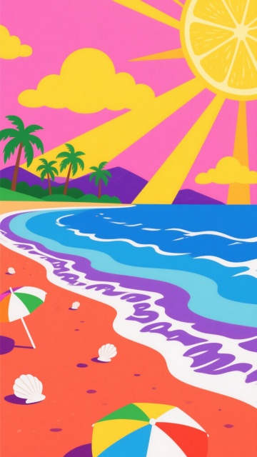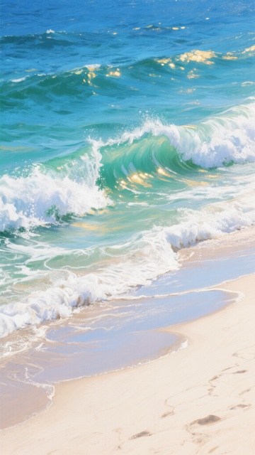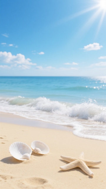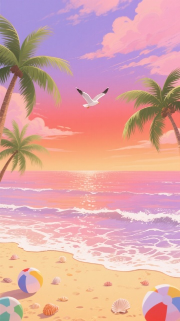 日落时分的海边风景,橙红色天空与深蓝色海面形成渐变,金色阳光洒在波光粼粼的海面上,远处有朦胧的岛屿轮廓,近处是细腻的金色沙滩,海浪轻柔地拍打着岸边,点缀着几只白色海鸟在空中飞翔,沙滩上散落着几颗彩色贝壳和漂流木,整体呈现出温暖浪漫的氛围,色彩浓郁饱和,光影对比强烈,具有印象派油画般的笔触质感。