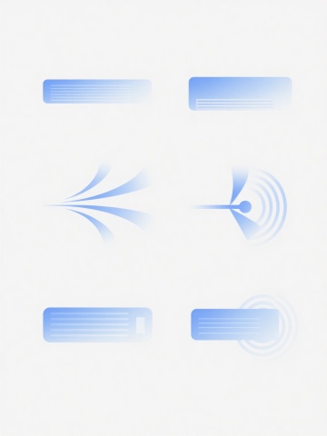 白色背景上,由6个完全不同造型的波浪线条元素组成的系列素材集合,每个波浪元素均保持原有的渐变蓝紫色调、细腻流畅的线条质感和现代简约的抽象风格,变换形态包括螺旋状、S形、放射状、锯齿状、环形和交叉状,所有元素规整排布,整体画面色彩和谐统一,线条平滑过渡,具有强烈的设计感和视觉美感。