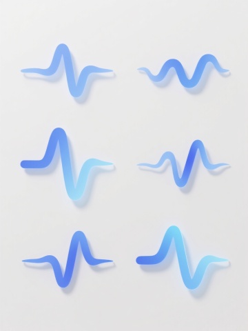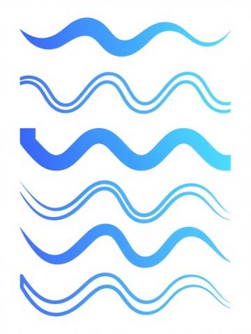 白色背景上,由6个完全不同造型的流线型波浪线条元素组成的系列素材集合,每个波浪元素均采用蓝紫色渐变色调,线条纤细流畅且具有韵律感,保持数字艺术的平滑过渡质感,整体色彩和谐统一,6个波浪元素以规整的网格状排布,每个元素形态各异,有的呈S形大波浪,有的是多层叠浪,有的是小幅度起伏的涟漪状,有的带有轻微的扭曲旋转,有的线条疏密有致形成渐变效果,有的则是不对称的波浪形态,所有元素均保持与原图一致的蓝紫色渐变风格和简洁现代的设计感,画面整体干净利落,信息传达清晰,视觉层级分明。