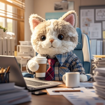 拟人风3D角色,猫咪身着商务西装,手握咖啡杯,办公桌前专注工作,展现职场幽默感。