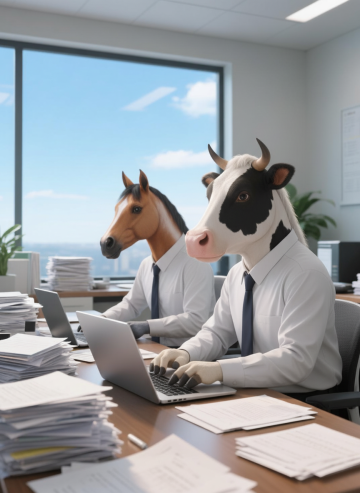 卡通斑马戴眼镜,拟人化办公场景,趣味感十足。