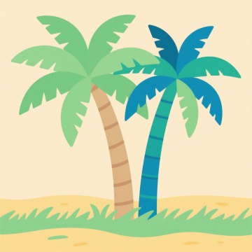 卡通风格插画,两棵椰树,树干呈浅棕色,带有环形纹理,左侧椰树稍高,树干略微弯曲,右侧椰树稍矮,两棵椰树的树冠均为宽大的绿色叶片,叶片边缘有自然的弧度和分叉,呈现出饱满的层次感,树干底部有绿色的草丛和低矮的植被,地面为浅黄色的沙地,整体色彩明快鲜亮,绿色叶片带有轻微的渐变效果,光影柔和,画面简洁清新,充满热带风情,无文字和二维码等元素。