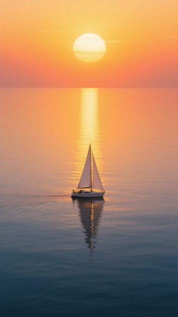 一幅展现帆船在广阔海面上航行的摄影作品,整体呈现温暖的日落色调,天空从顶部的明亮橙黄色逐渐过渡到底部的柔和橘红色,巨大的金色太阳位于画面上方中央,光芒万丈,在平静如镜的海面上投射出一条长长的、闪烁着金色光芒的倒影,延伸至画面下方中央。一艘白色的单桅帆船正航行在这片金色的海面上,帆船体积较小,位于画面中下部,船帆饱满,清晰可见,船身及船帆在水面上形成清晰的倒影。海面呈现出从近景的深蓝色向中远景的金黄色渐变的色彩层次,水面波光粼粼,细节丰富,展现出写实的海水质感和光影效果。画面采用极简的构图,大面积的天空和海面形成开阔的留白,营造出宁静、悠远、壮丽而又充满希望的氛围,没有任何文字、LOGO、二维码或多余元素干扰主体视觉。