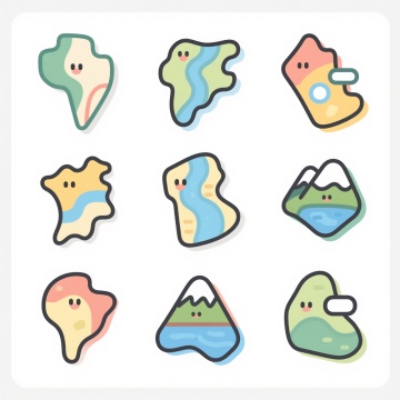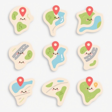 白色背景上的一组不同风格地图图标,保持可爱的卡通手绘风格,采用平滑圆润的线条和简洁的平面设计,每个图标具有独特的地图样式(如世界地图轮廓、区域地图、简化路线图等),使用柔和的蓝绿色调、温暖的橙色、清新的紫色和淡雅的灰色作为主要配色,地图上有简化的地形元素(绿色区域、蓝色水域、灰色道路),部分图标顶部有红色定位标记,整体风格统一且色彩明快协调,适合用于UI界面或应用图标设计。