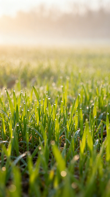 茂密的绿色草地,草叶细长柔软,整体呈现出深浅不一的绿色渐变,草丛中点缀着零星的小石子和泥土,自然随意的生长状态,阳光照射下草叶边缘泛着柔和的光泽,充满生机与活力的自然景象。