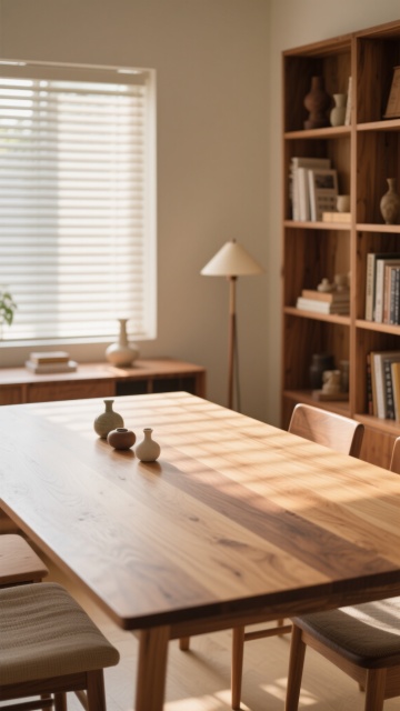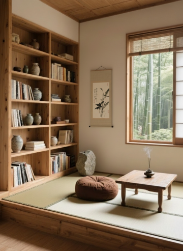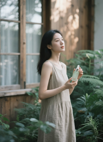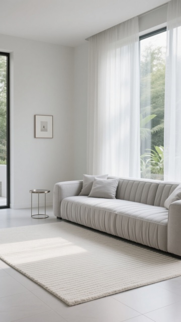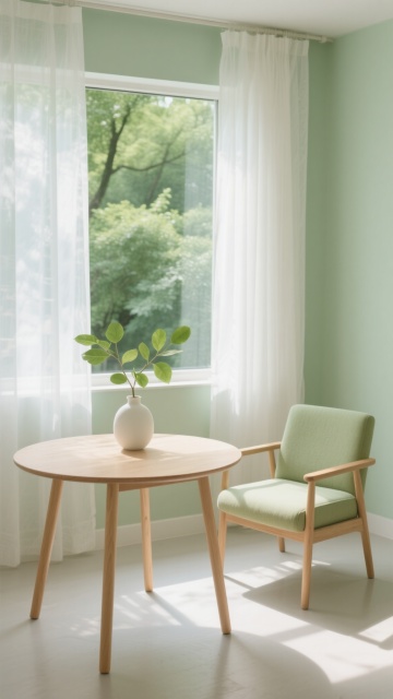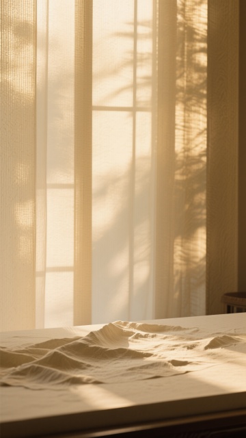 明亮通透的室内场景,柔和的自然光从法式玻璃门洒入,照亮整个空间,营造出宁静、舒适、温馨的氛围。前景中,一位穿着素雅连衣裙的女性侧身坐在藤编椅上,手持书本,姿态放松惬意,脚边散落着一双拖鞋,地面铺有浅色编织地毯。背景是两扇宽大的落地窗,悬挂着带有黑色书法文字图案的米白色亚麻质感窗帘,窗帘轻盈垂坠,随风微拂,书法字体飘逸洒脱,充满东方韵味。房间内陈设简约雅致,一旁的木质边桌上摆放着一盏造型古朴的台灯,光线柔和。窗外可见郁郁葱葱的绿色庭院,增添自然生机。整体画面采用写实风格,光影过渡自然,色彩以米白、浅灰、原木色为主调,温暖和谐,细节丰富,质感细腻,构图遵循三分法,视觉焦点集中在人物与窗帘的互动关系上,传递出悠闲自在的生活情调。