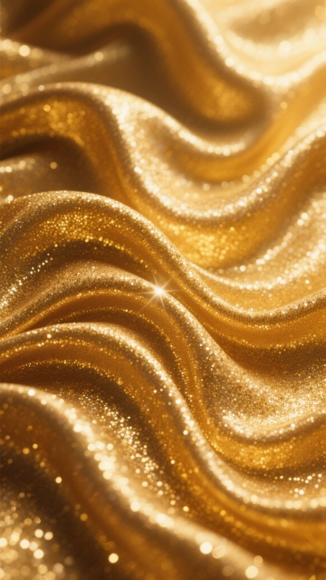 金色丝绸背景,如丝绸般顺滑的质感,呈现出高级的视觉效果。画面中金色的绸缎轻盈飘逸,具有流畅的波浪状褶皱,表面闪烁着细腻的金色光泽和微小的闪光颗粒,整体色调为温暖的金黄色,光影过渡自然柔和,营造出奢华、典雅、高贵的氛围,适合作为高端背景使用。
