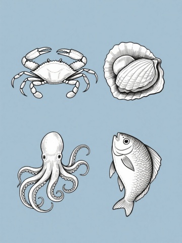 Set of 6 distinct seafood illustrations in detailed blue line art style on pure white background, featuring meticulously hand-drawn crustaceans and fish with precise cross-hatching and stippling techniques, including: 1) Side-facing mackerel with textured scales and fin details, 2) Detailed sea scallop with visible shell ridges and inner muscle, 3) Lateral view of spiny lobster with segmented antennae, 4) Swimming shrimp in mid-motion with curved abdomen, 5) Octopus with coiled tentacles and suckers, 6) Dungeness crab with extended pincers, arranged in clean 2x3 grid layout with consistent spacing, maintaining scientific illustration precision and vintage engraving aesthetic, no text or logos, isolated elements with fine line weights and organic texture rendering.