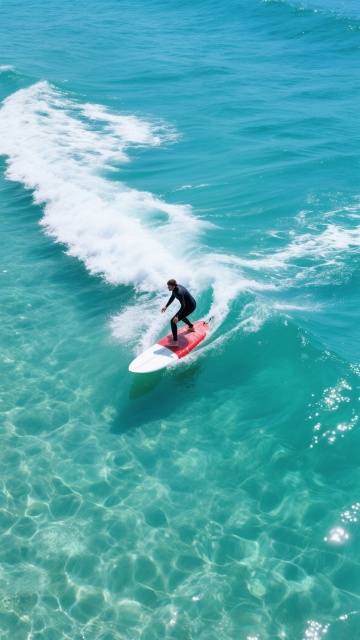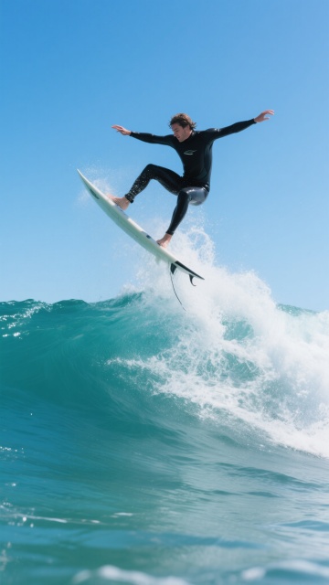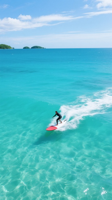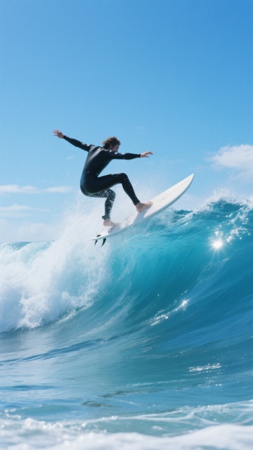 3D渲染风格的海浪背景,巨大的蓝色海浪呈现出清晰的浪花纹理和半透明的水膜质感,阳光从右上角照射下来,在浪花顶部形成明亮的高光和白色泡沫,海水呈现出从深蓝到浅蓝的渐变色彩,带有细腻的波纹和流动感,画面整体氛围明亮开阔,充满动感与力量。在海浪的浪尖下方,有一个微缩比例的3D冲浪小人,他正保持着平衡的姿态站在冲浪板上,迎着浪头,小人的身体姿态自然,细节清晰,与巨大的海浪形成鲜明的大小对比,突出其在壮阔海景中的灵动身影,整体画面兼具写实的海水质感与生动的动态捕捉,达到高度的视觉和谐统一。