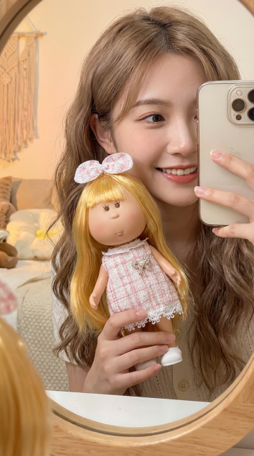 清新草原背景,少女与卡通版同步比心,插画风设计,充满夏日活力。