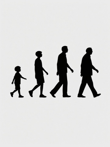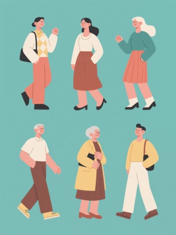 白色纯色背景上,六个完全不同造型和角度的黑色人物剪影,保持简约现代的设计风格,同元素同配色系列素材集合规整排布。包含男性和女性、老年人和年轻人,人物姿态各异,有的站立双手交叉,有的行走,有的坐姿,有的抬手,有的弯腰,有的侧身,所有剪影均为纯黑色轮廓,边缘平滑清晰,无内部细节,整体视觉层级分明,信息传达高效,符合简约设计感。