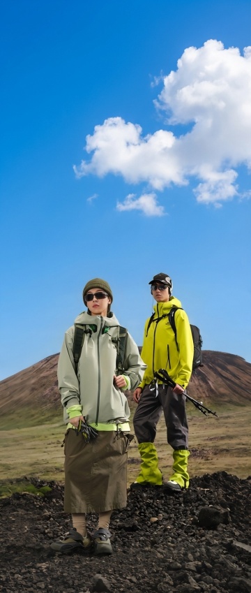 清新甜美,实景与插画风结合,少女在雪山下微笑,卡通形象增添趣味。