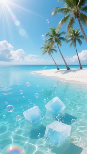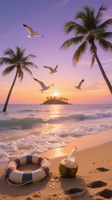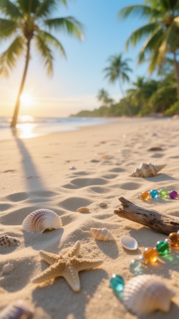 超写实摄影风格,黎明时分的热带岛屿沙滩,细腻洁白的沙滩从画面左下角向右上角延伸,近处海水呈现透明的浅绿松石色,逐渐过渡到远处深邃的靛蓝色海洋,海天相接处是柔和的粉紫色晨曦,天空中漂浮着几缕薄纱般的橙粉色云彩,左侧有几棵高大的椰子树,其宽大的羽状叶片垂落,在沙滩上投下细长而清晰的阴影,光线从画面右上角低角度照射,海面泛起金色的粼粼波光,整体色调清新明快,营造出宁静、治愈、充满希望的氛围,高清晰度,极佳的色彩饱和度与对比度,无文字元素。
