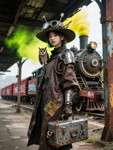 复古工业风蒸汽波,金属质感机能装,蒸汽火车背景,未来与过去的碰撞。