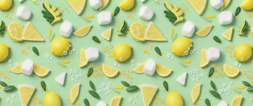 几何拼贴风格的夏日水果图案,以磨砂质感的象牙白为底色,网格状排列着几何化处理的柑橘切片:正圆形青柠切片(Pantone 362C)带有锯齿状白色描边,六边形柠檬切片(Pantone 102C)内部呈现放射状渐变纹理,不规则多边形莱姆切片(Pantone 382C)点缀着细小的白色圆点。每3个水果切片组成一个等边三角形单元,其间交错分布着四叶草变体图案——3片为标准心形叶片(Pantone 375C),1片中心嵌有微型柠檬黄(Pantone 108C)爱心。整体构图遵循黄金螺旋排列,元素间距保持精确的8px网格系统,所有轮廓采用2px圆角处理,营造出既结构化又充满呼吸感的现代设计,色调明快且具有数学韵律感,适合作为高端饮品包装或夏季主题数字界面的背景元素。