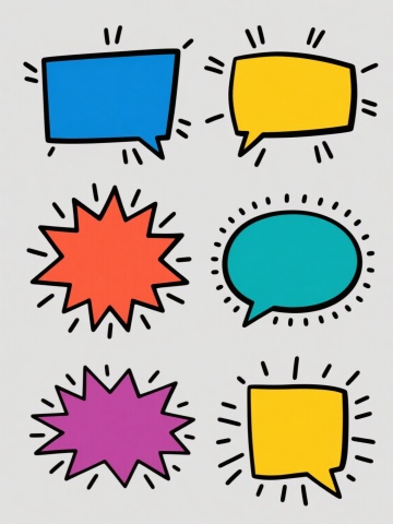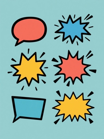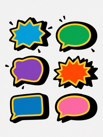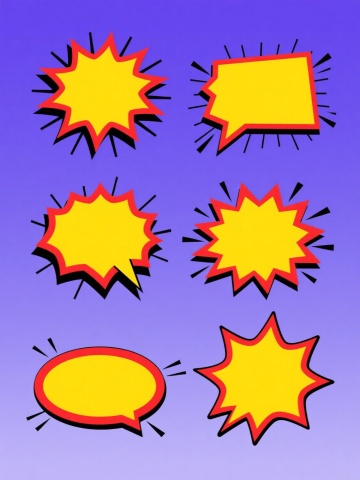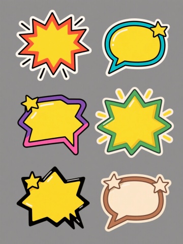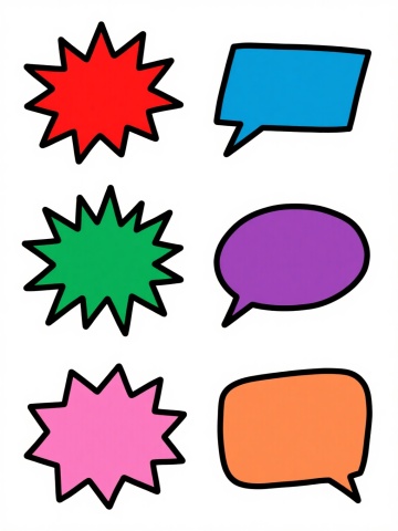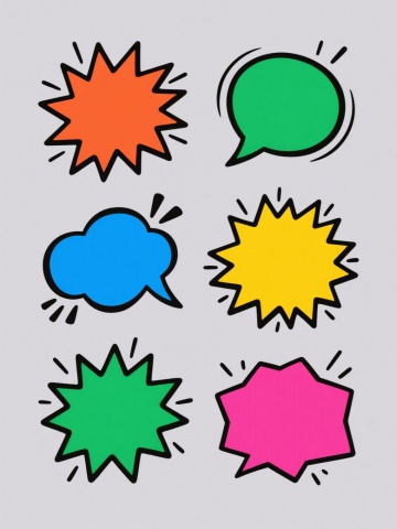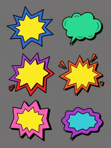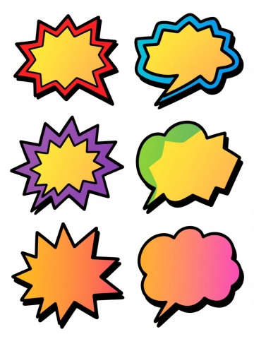6个不同配色、不同样式、不同材质的漫画风格爆炸对话框造型,采用鲜艳明快的色彩搭配,每个对话框拥有独特的线条装饰和填充纹理,整体呈现简洁的平面插画风格,排列在浅色背景上,上下两行对齐分布,保持一致的视觉节奏和卡通趣味性。