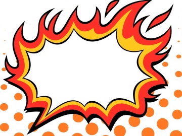 彩色漫画风格对话框,火焰状的不规则轮廓,边缘有鲜红与明黄渐变的尖锐线条装饰,底部点缀着大小不一的橙色半色调圆点图案,整体呈现出经典的美式漫画视觉语言,鲜明的红橙黄与纯白色背景的强烈对比,充满动态感和复古印刷质感的空白对话气泡设计,白色背景上的色彩如火焰般跳跃,保留黑色描边增强轮廓清晰度。