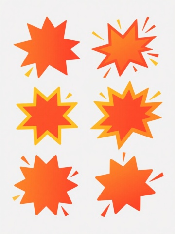 白色背景上整齐排列六个橙红色调促销主题元素,每个元素均为不规则放射状爆炸形轮廓,边缘线条平滑锐利,内部色彩从橙红色向黄色自然柔和过渡,部分元素带有细小装饰性尖角或延展线条,整体呈现活泼醒目、充满动感的现代扁平化设计风格,适合促销活动视觉强调。
