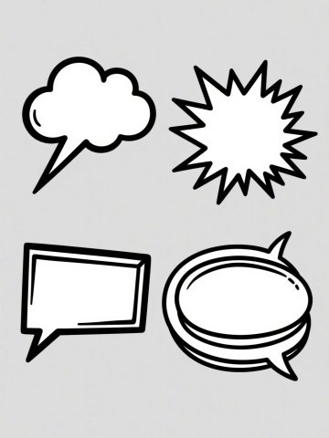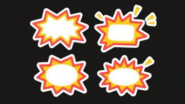 四个色彩鲜艳的爆炸对话框漫画图标,黄色填充,红色粗轮廓线条,白色背景,卡通风格,简洁平面设计,强烈促销感,醒目视觉效果,动态夸张形状,空白中心区域适合添加文字,促销元素,商业宣传设计,高对比度,吸引眼球,促销氛围浓厚,广告设计素材,促销标签,特价标识,促销海报元素,促销爆炸贴,促销符号,促销图标集