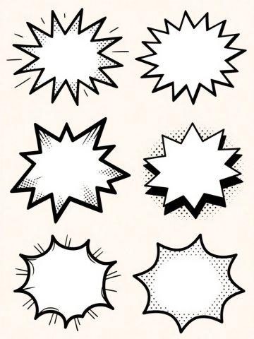 六个不同样式的漫画爆炸框素材,采用黑白线条手绘风格,每个爆炸框具有独特的尖锐边缘、放射状线条和点状纹理细节,统一以白色为浅色背景,六个爆炸框整齐排列为上下两行(每行三个),保持一致的视觉大小和间距,整体呈现出经典美式漫画的夸张表现力和复古印刷质感,无任何文字、LOGO、电话地址及二维码元素。