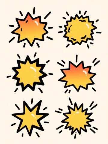手绘风格爆炸形状设计素材,六个不同配色、不同样式、不同材质的爆炸造型,采用上下两行对齐排列,浅色背景,线条粗犷随意,带有黑色轮廓和黄色渐变填充,边缘有不规则的锯齿状和放射状线条,整体呈现出活泼、醒目的卡通涂鸦效果。