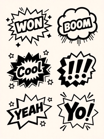 六个不同样式的漫画爆炸框素材,采用黑白对比强烈的美式漫画风格,线条粗犷有力,边缘带有锯齿状、放射状或云状等多样化的爆炸纹理,内部分别包含"WON"、"BOOM"、"Cool"、"!!!"、"YEAH"、"Yo"等英文感叹词,字体为粗体无衬线,带有手写感和动态倾斜效果,部分文字有阴影和高光处理增强立体感,爆炸框周围点缀着小星星、短线等漫画式装饰元素,整体排列为上下两行各三个对齐分布,背景为纯白色浅色背景,整体设计充满动感与夸张的视觉张力,符合漫画中强调情绪和音效的表现手法。