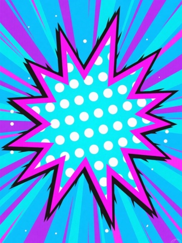 明亮的蓝色和紫色放射状线条从中心向外爆发,线条边缘带有尖锐的锯齿状,中心区域点缀着白色的半透明圆点图案,整体呈现出强烈的视觉冲击力和动感,色彩鲜明对比强烈,具有复古漫画风格的爆炸效果背景。