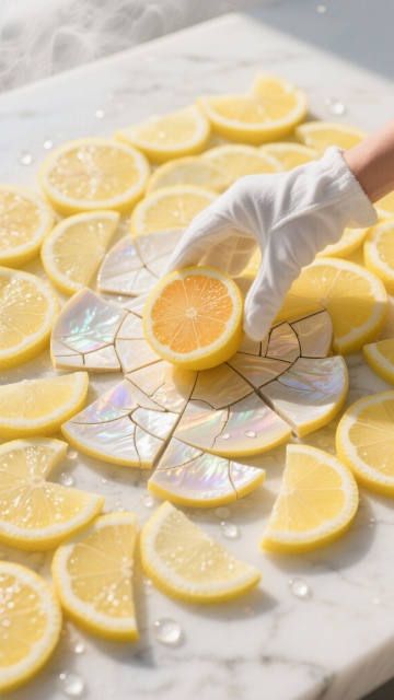 俯视角构图,清晨7点的阳光以45度角斜射进乡村厨房,原木餐桌上铺着带有细小格纹的亚麻桌布,三颗青柠与两颗柠檬组成自然的三角形构图,右侧一颗柠檬被锋利的水果刀精准对半切开,金黄的汁液正以完美的弧线飞溅,其中一滴水珠在阳光下折射出彩虹光谱,左侧青柠被切开四分之三,露出内部晶莹的果肉和白色脉络,旁边散落着几片带有锯齿边缘的新鲜薄荷叶,两枚完整的柑橘表面凝结着晨露,背景是打开的木质窗框和窗外淡蓝色的天空,空气中悬浮着细小的光晕尘埃,色调以青柠的翠绿、柠檬的明黄与亚麻的米白形成和谐三角,高对比度光影凸显柑橘表皮的凹凸纹理和水珠的透明质感,整个画面定格在夏日清晨最清新的第一缕切割瞬间。