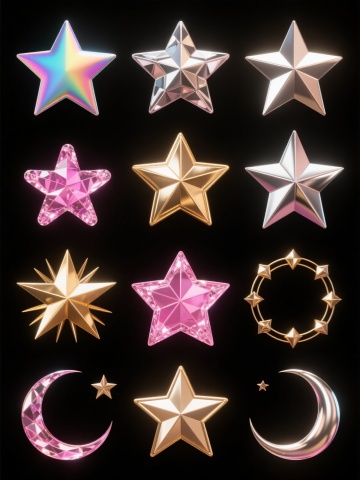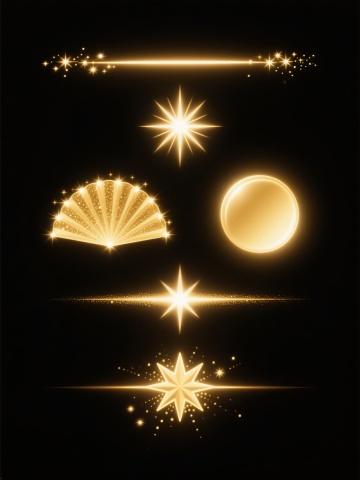 扁平插画风格,纯黑背景,六个具有高度统一视觉风格的数字艺术光效元素集合,每个元素均保留核心的圆形光晕结构、明亮的中心光点、向外辐射的锐利星芒以及彩色(浅金、浅粉、白)的边缘色散效果,整体呈现出强烈的科技感与未来感,光影对比鲜明,细节丰富。第一个元素为标准正圆形光晕配十字星芒,第二个是略微椭圆的光晕配放射状不规则星芒,第三个是中心光点偏移的不对称光晕配多束长短不一的星芒,第四个是光晕边缘带有细微锯齿纹理的圆形配米字形星芒,第五个是中心光点呈六边形的光晕配向外渐细的星芒,第六个是光晕内部带有同心圆纹理的圆形配十字交叉但末端分叉的星芒。所有元素采用相同的金粉色调为主的配色方案,以规整的2x3网格形式排布在纯黑背景上,元素间间距均匀,整体构图平衡且具有强烈的系列感和设计感。
