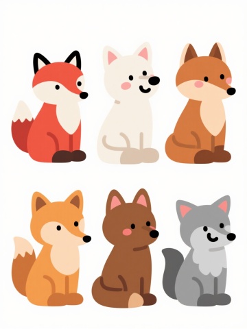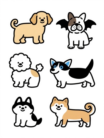 六个系列集合的卡通狗狗插画,每个画面保持相同的三只卡通狗狗元素内容,采用简洁的平面设计风格,轮廓线条清晰,色彩填充均匀,无渐变和复杂光影,每个系列画面整体色彩变换为不同的纯色背景,分别为红色、蓝色、黄色、绿色、紫色、橙色,三只狗狗造型完全不同,第一组为站立摇尾的柯基、趴着吐舌的金毛、坐着歪头的萨摩耶,第二组为跳跃的柴犬、奔跑的哈士奇、叼着骨头的腊肠犬,第三组为戴帽子的泰迪、戴眼镜的比熊、戴围巾的边牧,第四组为玩耍的博美、睡觉的拉布拉多、警觉的德牧,第五组为微笑的法斗、伸懒腰的阿拉斯加、舔爪子的吉娃娃,第六组为打招呼的雪纳瑞、打滚的巴哥、摇耳朵的西施犬,所有插画规整排布在一个画面中,形成整齐的系列素材集合,保持欢快可爱的氛围,画面简洁明快,适合作为卡通素材使用